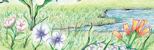 SYMBOLE : La nature printanière avec les fleurs, la rivière et les oiseaux.